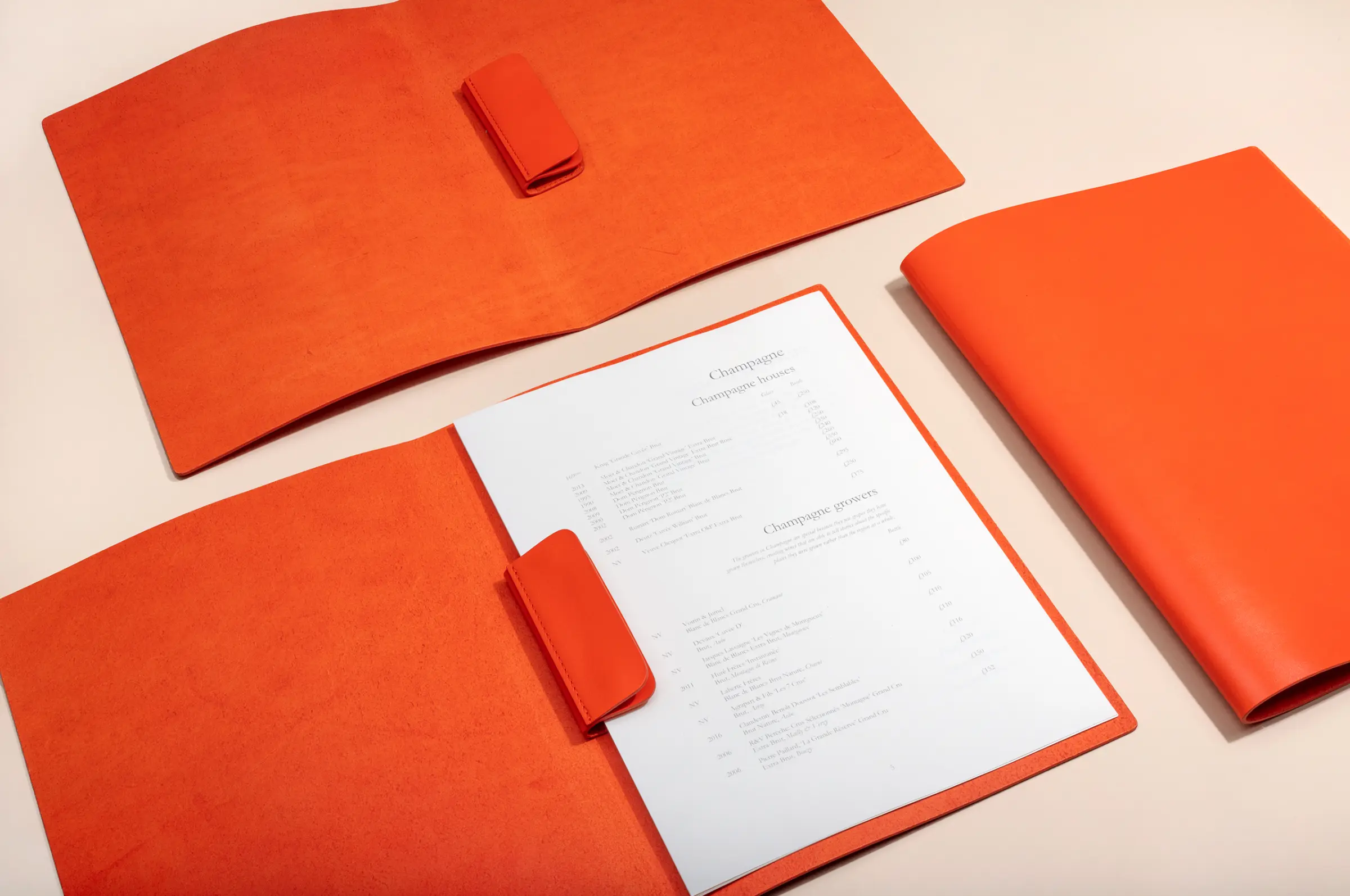 Part of an ongoing collaboration with Sanchez Brothers, leather menus in a vibrant Tempesti leather to match the interior decor. The reverse of the leather is finished with a special coating for durability in a restaurant environment including a leather covered screw fitting.