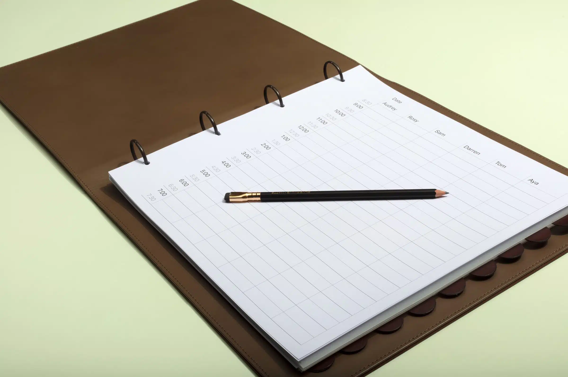 A set of bespoke appointment folders for Fourth Floor hair salon. The folders were made in a veg tanned Walpier Buttero leather from Italy. A premium leather was chosen to stand the test of time when a beautiful patina will develop and add character. Metal work sprayed to match RAL reference and division tabs cut and finished by hand.