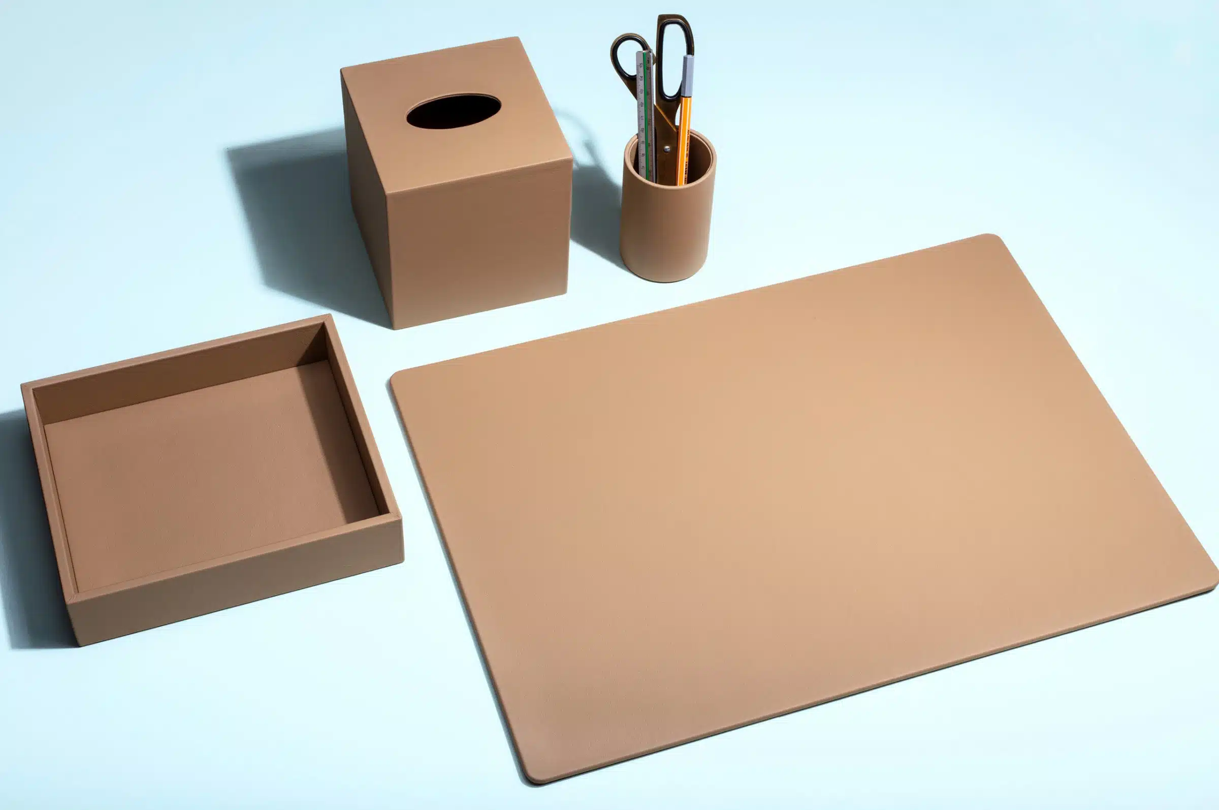A collection of contemporary desk accessories for the refurbished head offices. Briefed to produce a range of bespoke accessories to fit alongside new furniture and colour schemes. Luxury upholstery leather by Muirhead was used throughout to obtain a neat and modern feel.
